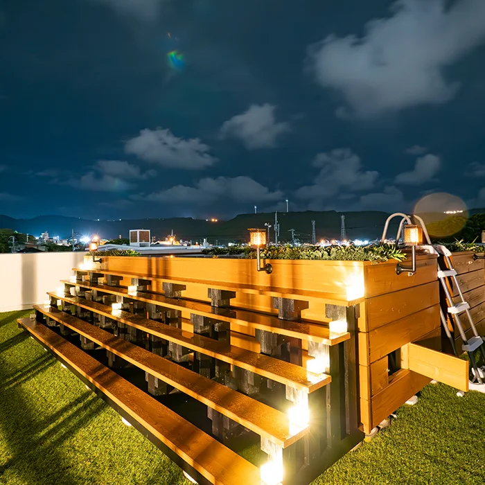 沖縄リゾートを満喫 POOL屋上テラスには、沖縄の広い空が満喫できる大きな共用プールを設置しております。